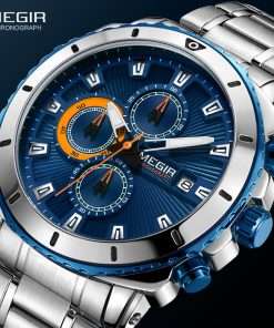 MEGIR Men's Blue Dial Chronograph Quartz Watches Fashion Stainless Steel Analogue Wristwatches for Man Luminous Hands 2075G-2 Men Quartz Watches